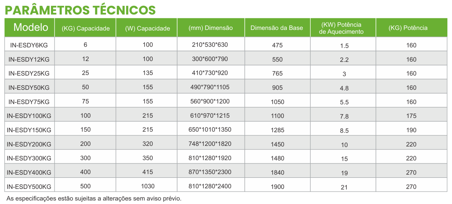 Método de seleção: quantidade de injeção por hora x 2,5 = quantidade de carga do secador.